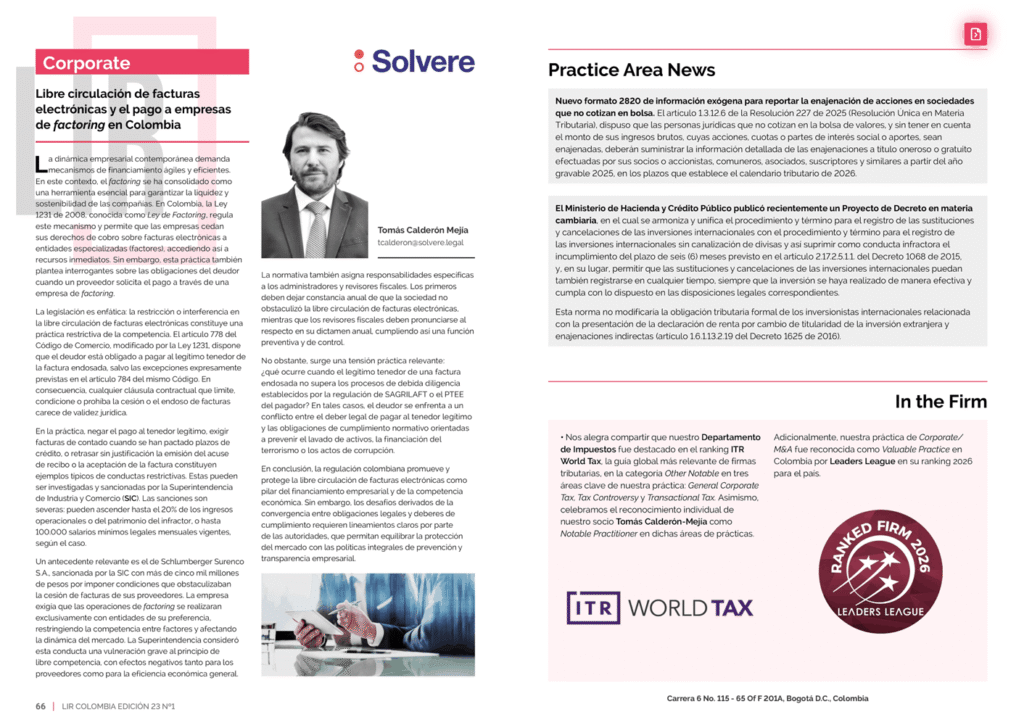 Compartimos un artículo publicado en The Legal Industry Reviews – Colombia (Edición 23 N.° 1 | Febrero 2026), por nuestro socio Tomás Calderón en el que analiza las implicaciones legales y prácticas asociadas al pago a empresas de factoring, en el contexto de la circulación de facturas electrónicas. Disponible en la página 66 de la edición.